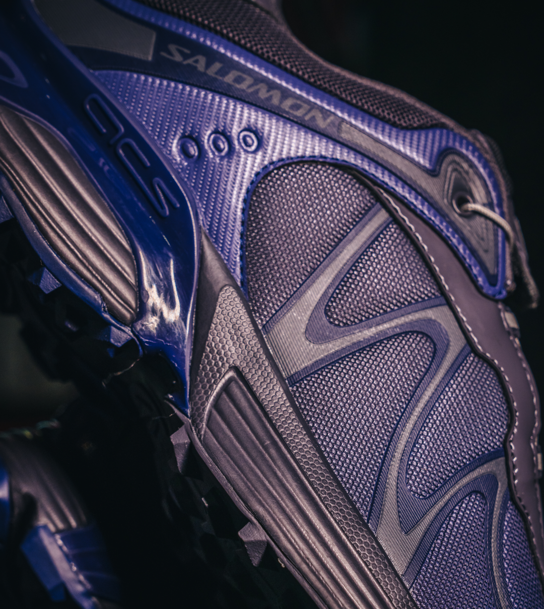 This exclusive version features a futuristic purple gradient inspired by electronic devices. The use of glossy materials and asymmetrical color-blocking gives the shoe a technical, industrial feel. The tongue and heel are decorated with Salomon and BEAMS logos in an asymmetric layout, adding subtle yet striking detail. Both brands’ logos also appear on the insole, underscoring the collaboration throughout.